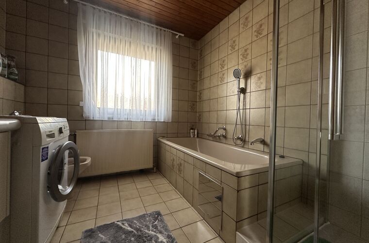 Darunter liegt ein voll unterkellerter Bereich mit etwa 107 m², der viel Platz für Hobby, Werkstatt oder Lager bietet. Auch eine Garage ist vorhanden.